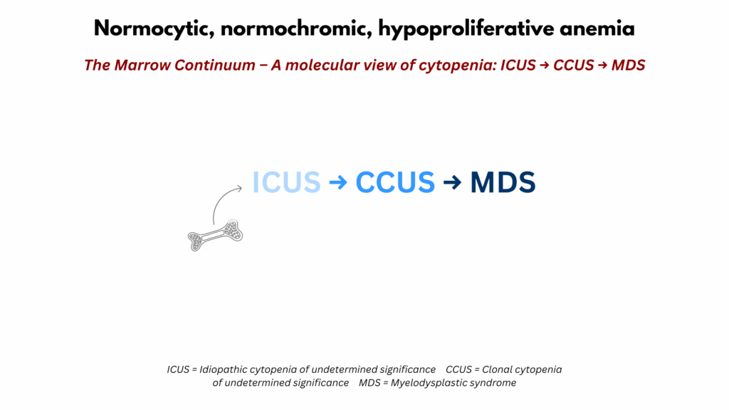 The term idiopathic cytopenia of undetermined significance (ICUS) sounds precise but is, in practice, a label of uncertainty. It refers to persistent cytopenia without identifiable cause, mutation, or dysplasia and is often presented as the earliest point along a clonal spectrum leading toward CCUS and MDS. Yet this framing is largely in the eye of the beholder. Investigators defining the ICUS–CCUS–MDS continuum are studying a subset of patients with unexplained cytopenia through a molecular lens, not the broader population of patients with mild, stable, hypoproliferative anemia. For many such individuals, the explanation may lie outside the marrow entirely—subtle kidney dysfunction, low-grade inflammation, hormonal changes, or nutritional insufficiency.