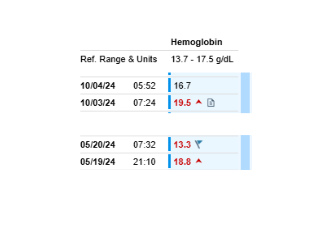 Shown here are two of several similar admissions in the same patient. In one episode, the hemoglobin fell from 18.8 g/dL on arrival to 13.3 g/dL nine hours later.