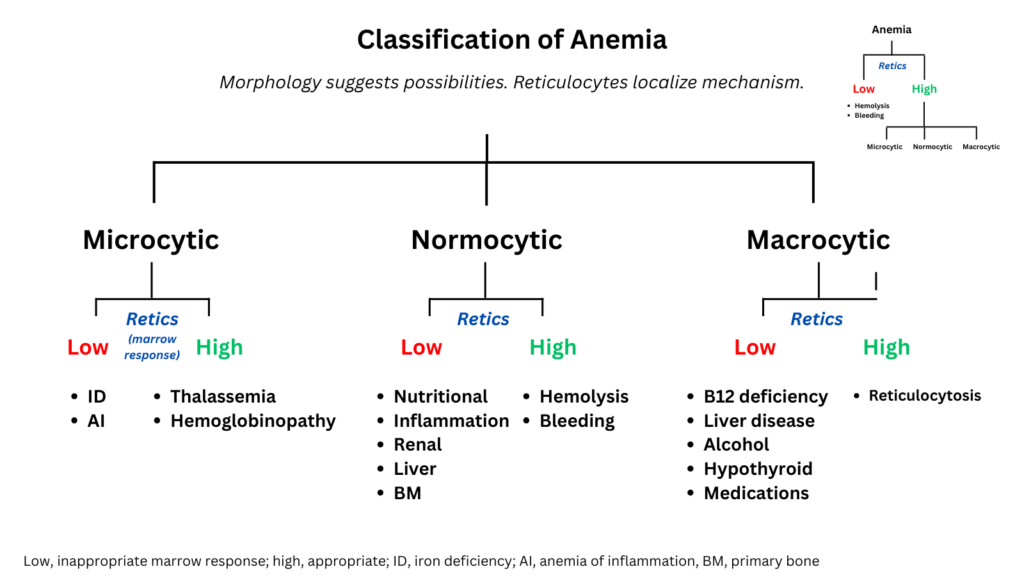 That is why many clinicians can evaluate anemia effectively without explicitly invoking mechanistic categories. The pattern itself is often sufficient to guide testing and treatment.