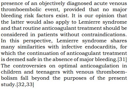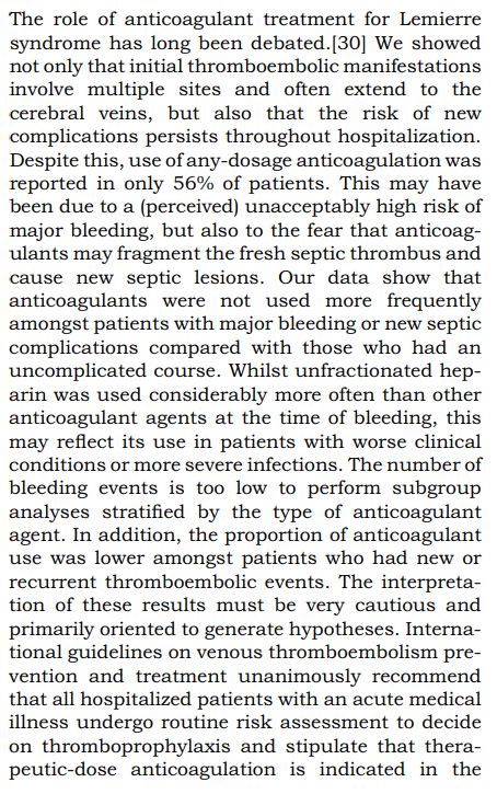 - Conclusions: “We found that, beyond the serious initial thromboembolic manifestations of the disorder, the rates of new or recurrent thromboembolic complications and septic lesions remain high despite hospitalization...the role of anticoagulant treatment for Lemierre syndrome has long been debated. We showed not only that initial thromboembolic manifestations involve multiple sites and often extend to the cerebral veins, but also that the risk of new complications persists throughout hospitalization… the interpretation of these results must be very cautious and primarily oriented to generate hypotheses. International guidelines on venous thromboembolism prevention and treatment unanimously recommend that all hospitalized patients with an acute medical illness undergo routine risk assessment to decide on thromboprophylaxis and stipulate that therapeutic-dose anticoagulation is indicated in the presence of an objectively diagnosed acute venous thromboembolic event, provided that no major bleeding risk factors exist. It is our opinion that the latter would also apply to Lemierre syndrome and that routine anticoagulant treatment should be considered in patients without contraindications.”