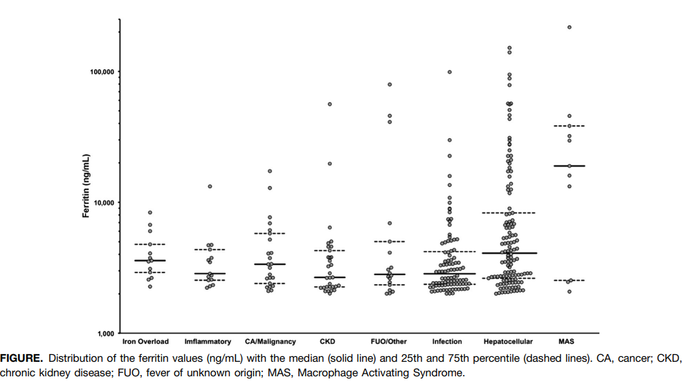 - Retrospective study of 333 adult inpatients with serum ferritin levels greater than 2,000 ng/mL: