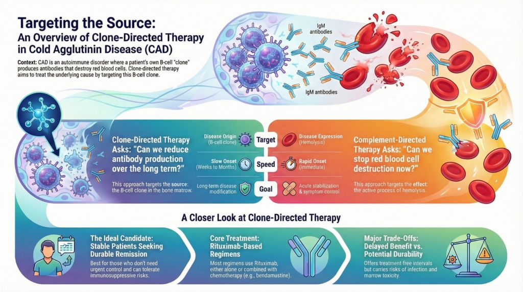 Complement-directed therapy and clone-directed therapy intervene at different points along this disease pathway. Complement inhibition acts at the effector phase to suppress ongoing hemolysis, whereas clone-directed therapy targets the upstream source of pathogenic antibody production. Because these approaches address different mechanisms, they serve different clinical purposes and should not be conflated, as emphasized in contemporary reviews of CAD management.2