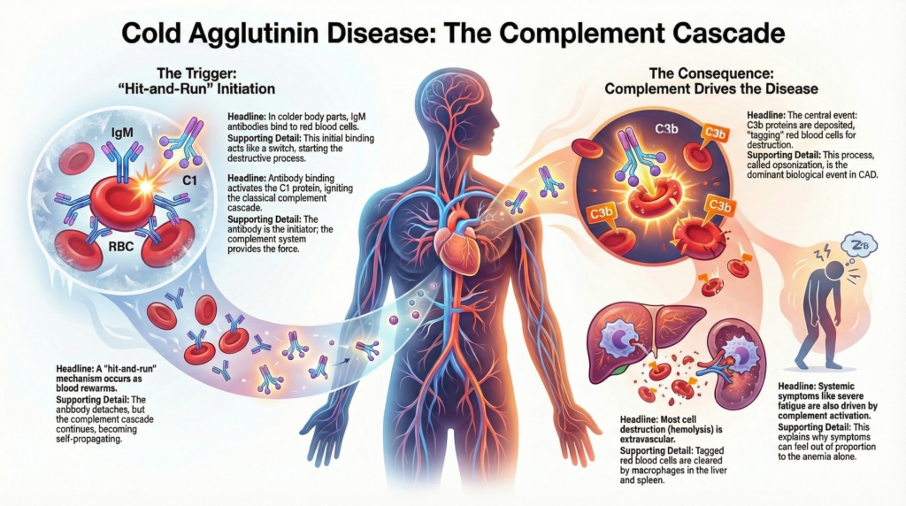Understanding CAD requires shifting focus away from antibody binding alone and toward the kinetics, amplification, regulation, and downstream consequences of complement activation, particularly at the level of C1 and C3. This is why CAD behaves differently from warm autoimmune hemolytic anemia, why corticosteroids fail, and why proximal complement inhibition is uniquely effective.2