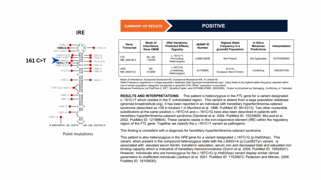| Diagnosis | ✅ Serum ferritin + TSAT ✅ Ophthalmology exam (cataract morphology) ✅ Genetic testing: targeted sequencing of FTL IRE region |