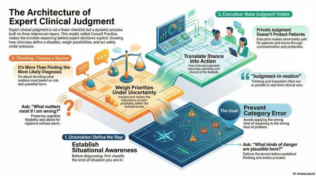 In Consult Practice, judgment unfolds across three linked layers: