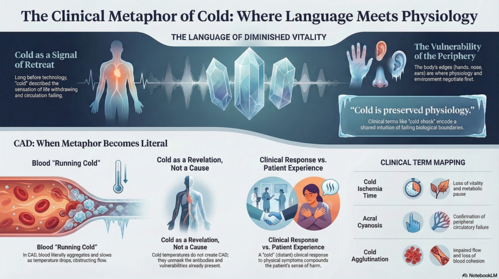Long before thermometers or molecular explanations, clinicians and patients used cold to describe what it felt like when life withdrew, when circulation failed to reach the margins, when vitality thinned. Cold was not simply a physical state. It was a language for diminished flow, weakened presence, and impending danger.