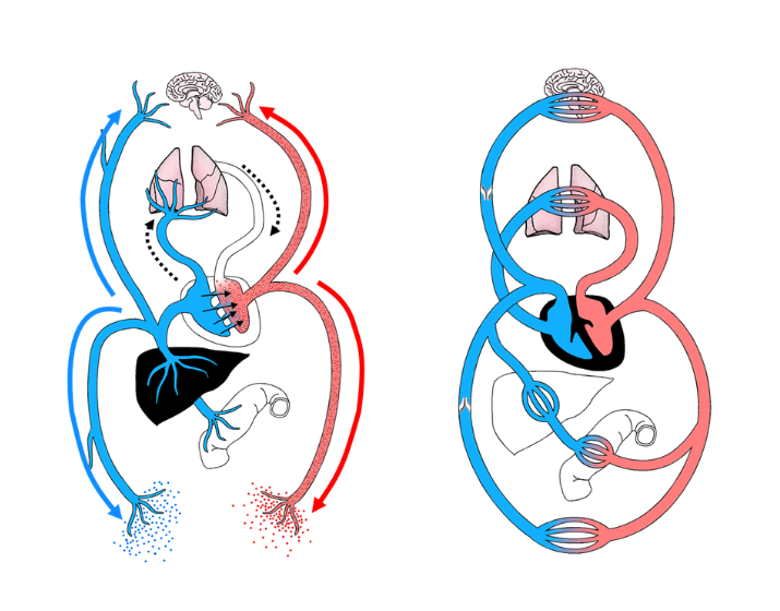 Right (Harvey): Harvey’s circulation (red = arterial, blue = venous) forms a closed loop. Blood moves from the right heart to the lungs, then from the left heart through the arteries, returning through the veins to the heart in a continuous, unidirectional circuit. The arterial and venous systems are connected by capillaries rather than open ends, and blood is recirculated, not consumed. This side-by-side contrast highlights the key differences: Galen’s dispersive, open-ended vascular trees with outward flow from two sources, versus Harvey’s closed, circular system driven by the heart as a pump.