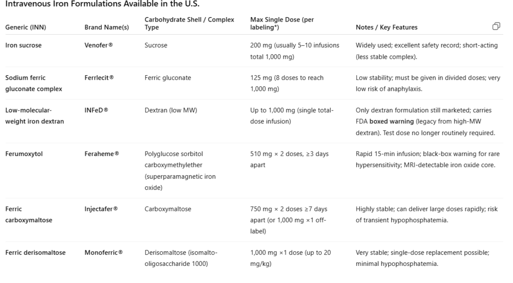 Iron Dextran (INFeD) and Ferumoxytol (Feraheme) have black box warnings, largely because of past safety signals of serious hypersensitivity and anaphylaxis. The other IV iron formulations don’t carry boxed warnings because their risk profiles (both in clinical trials and postmarketing surveillance) have been more favorable, and no strong enough signal has required that level of regulatory warning. But the difference is not absolute — it reflects regulatory caution, historical risk, and observed reaction rates more than a mechanistic “safe vs unsafe” split.