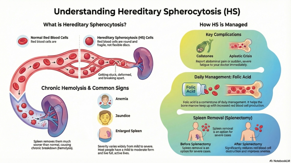 Most people with HS live normal, active lives. Take folic acid consistently, attend regular follow-up visits, stay hydrated, and report new symptoms such as increasing fatigue, jaundice, or abdominal pain. If you have had a splenectomy, fever is always an urgent concern and should be evaluated promptly.