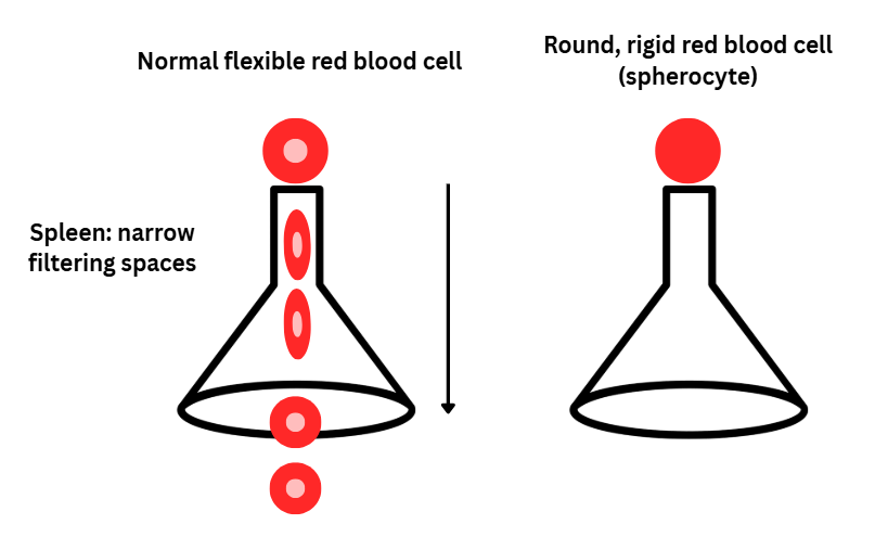 When membrane proteins are altered, RBCs lose their flexible, biconcave shape and become round. These spherocytes cannot pass easily through the spleen’s narrow channels, so they become trapped and are destroyed earlier than normal.