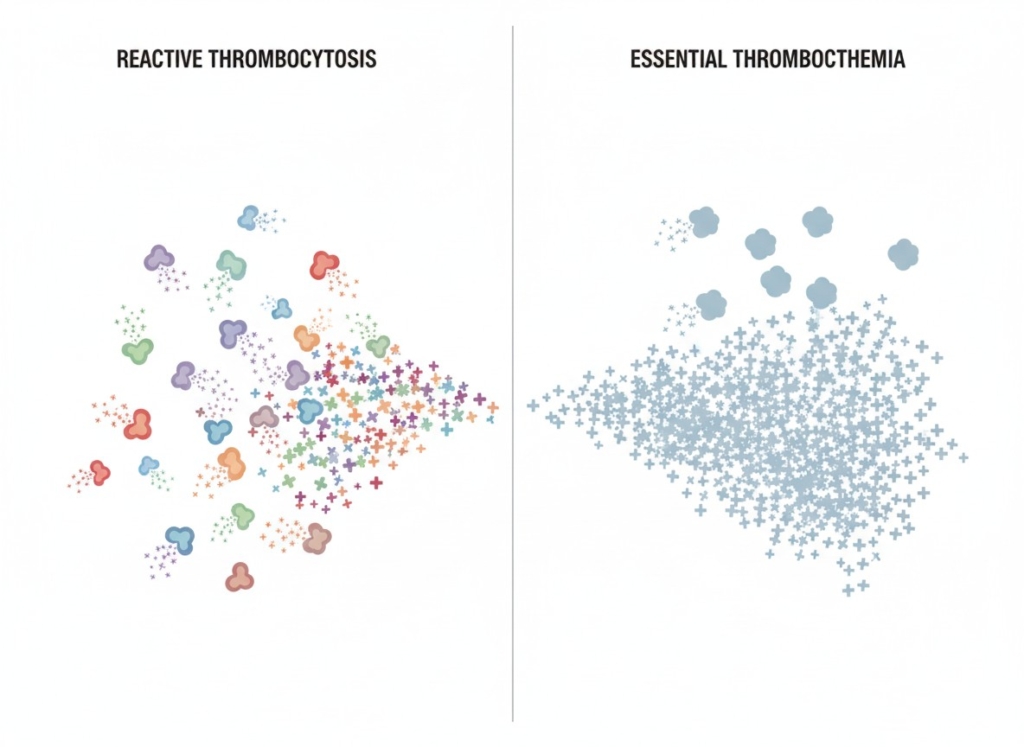 In primary thrombocytosis (such as essential thrombocythemia), the platelets themselves may be abnormal, and the risk of blood clots is higher even at similar platelet levels. These conditions require close monitoring and sometimes treatment by a hematologist.