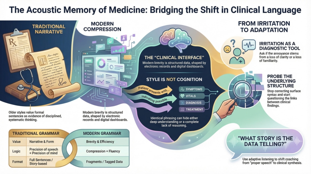 In the environments where many of us trained, language carried moral weight. Full sentences signaled discipline. Formal phrasing signaled seriousness. Precision of speech suggested precision of mind. The case presentation was not merely informational. It was performative evidence of thought.